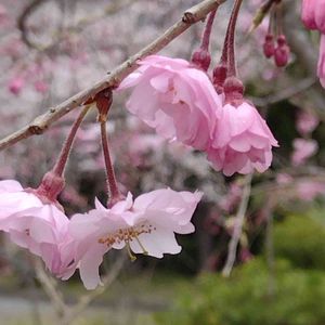 散歩道(京都丹波亀岡 南郷公園)の八重咲き紅枝垂れ桜の開花です。