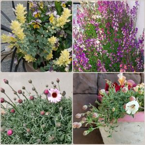 おはようございます😊 天気よくて気持ちいい~🎶 ㊧㊤ロータスブリムストーン 黄色のもふもふが可愛い🤗 ㊨㊤リナリア 満開でーす🙌これでも全部は入りきれてません😅 ㊧㊦ローダンセマム エルフピンク 開花記念✨この時期はしっかりピンクで嬉しい! ㊨㊦シレネ ナッキーホワイト こちらも開花記念✨提灯型のお花が可愛い😄