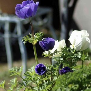 アネモネがきれいに咲いています♡‧₊˚ パセリのような葉っぱもステキです🌿 鉢植えだけど、フェンス内側の花壇の空いた場所に置いてます。春に芽が出てくるまで(*^ー^)