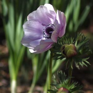 原種アネモネ レベイレイ 2年目の子です。 花茎が1本だけ上がって蕾があと3ケ😅 シルベストリスと一緒に鉢にいれてましたが、あまりにパンパンに茂ったので、春先、花壇におろしました。 茂ってた割に、花付きはあまり良くなくて、少しガッカリ😮💨 小さい花だけど、シベが青くて可愛いですね💜💙♡︎ᵎᵎᵎ♡̷︎♡⃜︎♡⃡︎