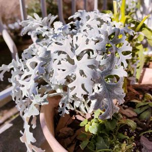 ♡今日のお花♡ シロタエギク 寄せ植え2作品目✨ 昨年秋に植えたものですが、とても良い株で今も立派に茂ってくれています✨☺ 存在感があり過ぎてお花がかすむ程>.< 手前はビオラですが、この子はあんまり咲かないまま😢 シロタエギクさん、素敵なのでそのうち挿し木に挑戦するつもりですᕙ( • ‿ • )ᕗ