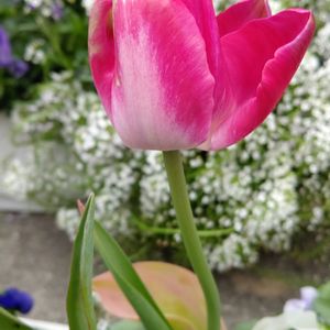 チューリップ🌷⑦ 🌷GSで賞品で頂いた20種類の富山産の球根のうちのひとつ 📛「あけぼの」 色:黄 輝くような大輪伸びて八重咲き 😲❓️ 赤色で一重 📛つけるの間違えたよね😅 わけがわからなくなってきたよ😱