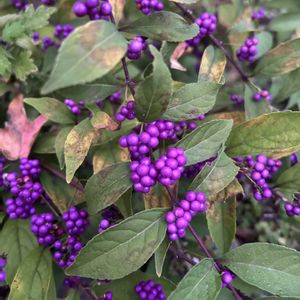 朝がめっきり 寒くなりました🧣・* 💜💜💜💜 ...... コムラサキの美しい実 ......... 💜💜💜💜 でもなぜか? 葉がきれい育たない ⤵︎ ︎⤵︎ ︎⤵︎ ︎
