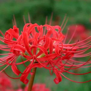 【ヒガンバナ(彼岸花・曼珠沙華)】 中国原産、ヒガンバナ科多年草 秋のお彼岸を象徴する花。 人家に近い田畑の縁、堤防、墓地などに群生して、花期には人目をひく。 1本の真っ直ぐな緑色の茎の先端に、直径約10cm前後の花を咲かせる。 幅は5mm程度、長さは4cm程の花びらを6、7枚放射状に付ける。 草丈:20~50cm 開花期: 9月~10月中旬 花色: 赤,白,黄,ピンク 近所の川土手にて