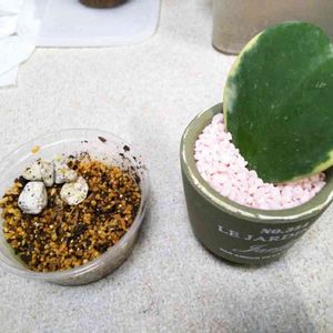半年以上左の鹿沼土で発根させていたハートホヤ(カーリー)の葉っぱを思いつきでインテリア調にしてみました❗ 思いつきでやるものだから、器の文字と葉の向きがズレてるのに完成してから気づくんですね・・・😳
