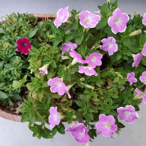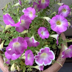 🍀 サフィニアアート いちごシェイク 昨年の春にお迎えしたサントリーの サフィニア いちごシェイク🍓 サントリーさんの苗は優秀ですね☺️ 秋に小さくカット✂️して冬越しして 今は春を待っている感じです サフィニアが咲く時期ではないのですが 1輪だけ咲いてくれました🌸🎶