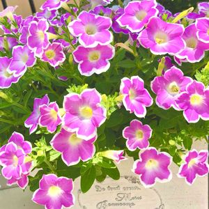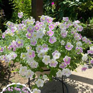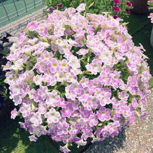サフィニアアート🌼*・ 挿し芽組さんは日中、直射日光で頑張ってます。 色は白が強くなって…⁉️ 中には真っ白ないちごシェイクが🤭🎵 やっぱり陽射しの当たり具合で色の出方変わるのかしら🤔