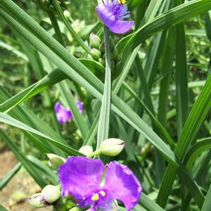 紫露草(ムラサキツユクサ) 1870年頃に観賞用で入った北アメリカ原産の帰化植物。道端、空き地などで見かけるツユクサ科の多年草。半日花で早朝に咲き午後にはしぼむが、夏中次々と咲く。乾燥に強く、日照りの時は葉をくるんと巻いて乾燥に耐える。 生物学の実験材料に使われるほか、利尿薬として利用される。 ムラサキツユクサは細かく分けるとムラサキツユクサとオオムラサキツユクサの2種類ある。ムラサキツユクサは高さ50㎝ほどで花が小さい。オオムラサキツユクサは高さ1mほどで花は大きめ、葉の幅が広く中央の脈のところではっきりした折れ目があり、花色も豊富。 出典『都会の草花図鑑』『街で見かける雑草・野草図鑑』