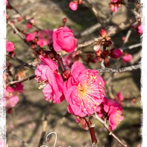 水戸の偕楽園へ初めて行って来ました🚙 梅はまだなので、ほとんど人はいません😄 唯一咲いていた『八重寒紅』という名札の付いていた早咲きの品種と書いてありました💗