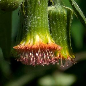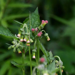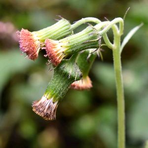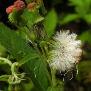 紅花襤褸菊(ベニバナボロギク) キク科ベニバナボロギク属の一年草。1946年に北九州で侵入が確認されたアフリカ原産の帰化植物。林縁や道端、伐採跡地などに生える。葉は柔らかく、春菊のような強い香りがある。葉は倒卵形長楕円形で互生する。下部の葉は羽状に裂ける。花期は8~10月。花序は先が垂れ下向きに頭花をつける。頭花はすべて細い筒状花からなり、花冠はレンガ色、下部は白色。総苞は長さ約1㎝で、総苞内片はきれいに1列に並び、外片はごく小さい。果実は痩果で細い円柱形。冠毛は純白で痩果からはがれやすい。長い冠毛がついた種子は風でかなり遠くまで運ばれるので短期間に分布を広げた。第二次世界大戦中は南洋春菊、昭和草と呼んで兵士たちが食用とした。海外では野菜として利用している地域もある。 全体の姿が段戸襤褸菊(ダンドボロギク💬1933年に愛知県の段戸山で発見された北アメリカ原産の帰化植物)に似ていて、頭花が紅色なことが名前の由来。襤褸とは、花が終わりかけるとできる白い毛のこと。山火事跡などにいち早く入り込むため、アメリカでは『fire weed』(火の草)と呼ばれている。 出典『野に咲く花』『色で見わけ五感で楽しむ野草図鑑』