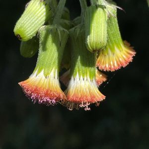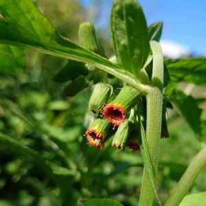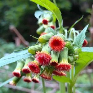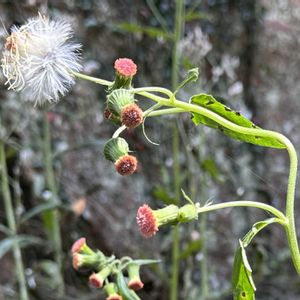 ベニバナボロギク(紅花襤褸菊) キク科ベニバナボロギク属の一年草。 アフリカ原産。 帰化植物 ○ 森林が伐採された際などに一斉に出現し、パイオニア植物としての姿を見せます。 まだ咲いていました♪(๑ᴖ◡ᴖ๑)♪ 柔らかな草で、筒状の先端が赤くなる花をつける。 茎頂や枝先、上部の葉腋から、長さ5~8㎝の花序を伸ばし、長さ1~1.5cmの中央が細くなった円筒形の頭花をつけます。 頭花は両性で先端が5裂する筒状花のみからなり、茎頂に数個がつき、すべて下向きに垂れて咲きます。 舌状花がないので、花が咲いても色が付く程度で、形の上では頭花の先端が若干膨らんで見える程度です。 筒状花の先きは朱赤色で、基部は白色です。 雌しべの先端は2裂し、先端は長く伸び出し、後に巻くようになります。 雄しべの葯は癒着し葯筒をつくります。 雄性先熟で、雄しべが先に熟し、その後、雌しべが成熟します。成熟の時期をずらすことで、自家受粉を避ける仕組みです。 花が終わると、頭花は上を向いてきます。そして綿毛になり風に吹かれて舞い立ちます🪽 果実は長さ2mmほどの円柱形で赤褐色の痩果で、先端に長さ12mmほどの白い綿毛が多数あります。