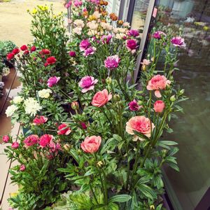 ラナンキュラスラックス達 テラスのラックス達が花盛り💜🩷❤️💛🤍グレーシスも何とか間に合いました!パンビオ達との共演も今が最盛期🎵
