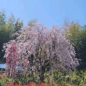 素敵なしだれ桜 よく通る道のそばなのです 毎年めっちゃ綺麗に咲いてます かなり大きな木で密かな楽しみ この場所で今年はじめてのウグイスの声も聞けました