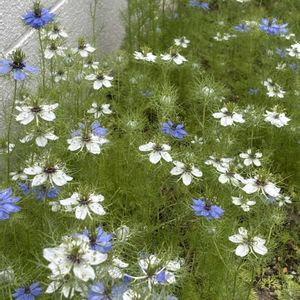 🪴草花たち その⑧ ニゲラ(クロタネソウ) 爽やかなブルーのニゲラが涼しげに咲いていました。 細い葉っぱや特徴あるその花の印象が繊細で、その佇まいが儚げに思えます。 英名の「love in the mist」→「霧の中の愛(恋人)」と言う言葉がピッタリ♡ 「Devil in a bush」と言ったのは どうしたことなんでしょう〜( ̄▽ ̄;) ⌘ メモ ⌘ 🔸科名・属名 キンポウゲ科 クロタネソウ属 🔸学名 Nigella 🔸英名 Devil-in-a-bush Love in a mist 🔸原産地 南ヨーロッパ、 中東 南西アジア 🔸花期 4月〜7月 🔸形態 秋まき一年草。 葉は糸のように細く、裂けて広がるような形で展開 する。花は3〜5cmほどで、花色は白、ブルー、 ピンクなど。花弁に見える部分は萼片でトゲのよう に見える糸状の総ほう片が周囲を覆うようにつく、 独特の花姿をしている。実は、風船のように球状に なり、ドライフラワーによく用いられる。 この実の中には別名の通り黒いタネが入っている。 品種によるが、香辛料とされている。