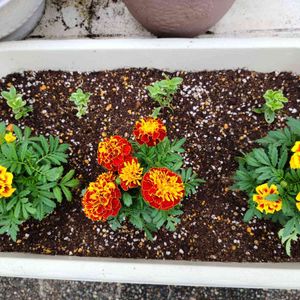 マリゴールドが随分賑やかになってきました。 奥にブルーデージーの苗も植えたけど見えない❗ 花茄子も色が付いて可愛いですね~。花丈は全然大きく成らないけど花は沢山さいてます。