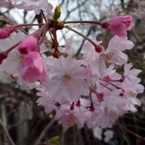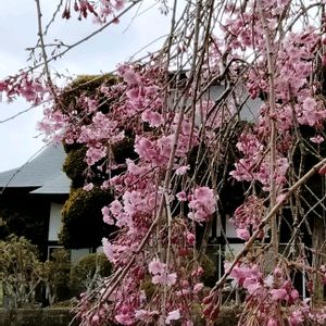庭の桜でもう一本 八重枝垂れ桜🌸 この木が主人は気に入らない、切ろう切ろうと言っている😰 木の枝振りが悪いのと、一重が好きで八重は好みではないそうな😡 私は毎年抵抗しながら、この木も3メートルを越している