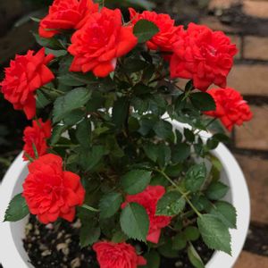 極小ミニバラ リトルマリー がこんなに咲いてます❤️ 想像していたよりも刺激的な朱色だから小さくてもインパクトが強い❗️ 激安ボロボロだったので、家にある白のプラスチック鉢にとりあえず入れたのですが、花と鉢のコントラストが強すぎて、この色合いならテラコッタの方が優しい雰囲気になるのかも🎶