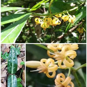 チトセカズラ(マチン科) Gardeneria multiflora Makino 日本では、兵庫県西播磨、中国地方のごく一部に自生します。若い個体の葉は、葉脈に沿って白い斑が入ります。絶滅危惧Ⅱ類(VU)に指定されています。
