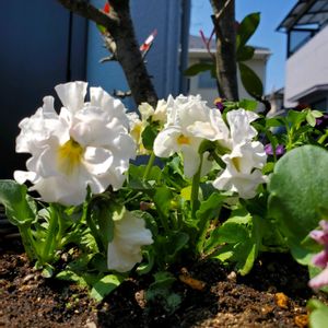 3月4日 昨日降った雪❄️がうっすらと積もってます ビオラ ヌーヴェル·ヴァーグのラピスラズリさん 寒さにも耐えて 元気に微笑んでます
