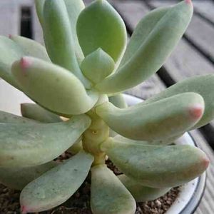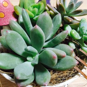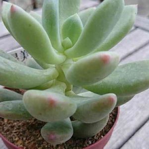 青星美人。コメ○多肉。びよんびよんに徒長していたので、先っぽだけチョンパしてテキトーに挿しといたら、思いの外綺麗な可愛いピンクに紅葉😳葉挿しがいっぱいあるから増えるといいなぁ☺️しかしコ○リの水ビシャビシャ&万年日陰、売れなくなると水無しカラッカラ。何とかならないもんかね💧
