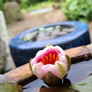 今日のお花─ スイレン 玄関横の多数のメダカ鉢に メダカと共に、 スイレンやホテイアオイが共存していますよ🍀