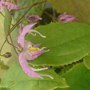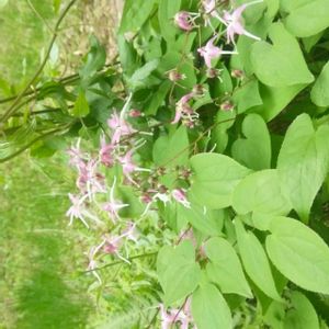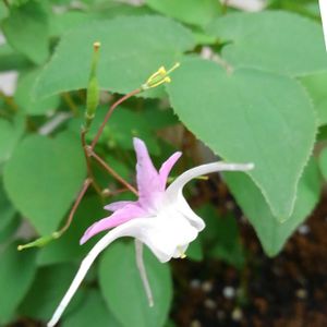 おはようございます 今日のお花 イカリソク ピンクの花は池のそばで 咲いています トキワイカリソウ西洋柊の下で咲いています 花友の庭で 毎年癒されてます