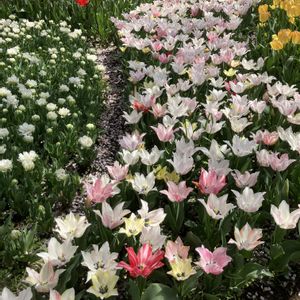全日本空手道連盟が育てるカラテという名のチューリップ(前面から奥に続くチューリップ) カラテは強くなると帯の色が変わる様に、このチューリップも色が変わります
