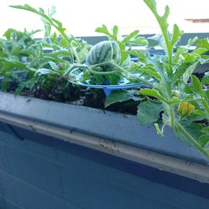 【プランターでスイカ🍉が出来るか?やってます😅💦】 ベランダの高さ23cmの横長プランター 昨年食べたスイカ🍉の種で育ててます。 そもそもプランターでスイカ🍉が可能なのか? 半信半疑でやってましたが スイカ🍉なるんですね😁👍 pic2 スイカ🍉のツタ🌿?茎?は 土壌の中に埋め込みました。 葉だけ土壌から出して育成 土壌が小さいので 茎間からも根を発根させて 水分養分を吸収させたい為 これも自信なかったのよ🤔 このアイデアは 実は夢で見たので😴💤💡😳 翌日実行した感じ なんと これが成功したので プランター育成も上手く行ってるのかもしれない。 pic3 たぶん…金色羅王だと思いました。 黄色いスイカ🍉だったかな…🤔 このベランダプランターは ビオラ パンジー育種で使ってるので 夏場は使ってないので スイカ🍉をやって見た感じ これで 家庭ベランダでもスイカ🍉は可能て事かもですね😁