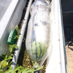 【プランターで🍉スイカ栽培 コカ・コーラのペットボトル】 ちょとスイカ🍉に コカ・コーラのペットボトルを被せて育成する事に…😆 ペットボトルを上から半分まで裂き スイカ🍉をインストール👉🍉 これで 外敵から守られ コカ・コーラ型のスイカ🍉が出来るんじゃね❓️ pic2 ペットボトルの口元に針金で空中でもイケる様吊り下げも可能 万が一水が浸入した時の為に下に穴を開けてます。 てな訳で スイカコーク🍉が出来たら笑える😆😂🤣