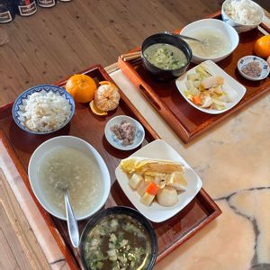 朝ごはん お焦げご飯 フカヒレスープ 味噌汁、わかめ 白菜、蕪、大根、人参とぎ汁漬け ツケアミ ポンカン