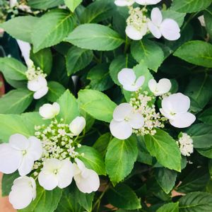 ラグランジアブライダルシャワー💠 昨年カットして,こんもりの中から ビヨーンビヨーンと新芽が伸びてます。 その新芽にも花芽がついてきました。 ギザギザの花びらが、ヒラヒラ白い花が咲いてます。🤍 普通の紫陽花のように丸い塊にはならないから,一見地味見えますが、 清楚な感じが素敵です。🤗💕🤍