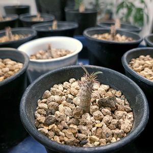 グラキリス実生。少し逞しくなってきました。幹が茶色くなってきた株もあります。晴れて気温の高い日は、外で管理するようになりました。