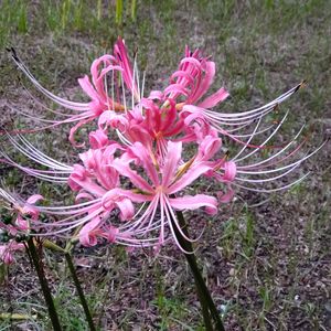 今日のお花 ヒガンバナ(彼岸花)は リコリス属の代表的な植物で 鮮やかな赤が一般的ですが 突然変異や他のリコリスとの交雑で ピンクや白花になることがあるようです。 花を咲かせた後 葉っぱが伸びて 地下の鱗茎(球根)に養分を蓄え 翌年の初夏には葉っぱは 枯れて 休眠に入ります。 彼岸花は 花姿がクモのように見えることから スパイダーリリー(spider lily)の別名でも呼ばれるのだとか…。 中国原産。 ヒガンバナ科ヒガンバナ属の多年草。