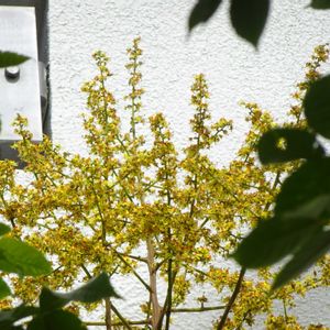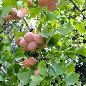 イチョウ(銀杏)の実がたわわに実っています。 外側の黄色い果肉は 強烈な臭いがして中の実を取り出すのが少々厄介です…。😆 硬い実の中にある"仁"の部分が銀杏ですが ほろ苦くモッチリした食感が美味しくて 茶碗蒸しには欠かせませんね。☝️✨ イチョウは 雌雄異株の植物で 雄木に雄花 雌木に雌花を咲かせます。 風媒花で 花粉は1km以上も風に運ばれるそうで 運ばれた花粉で受粉し 実が出来るのだとか…。😧 中国南東部原産。 イチョウ科イチョウ属の落葉高木。