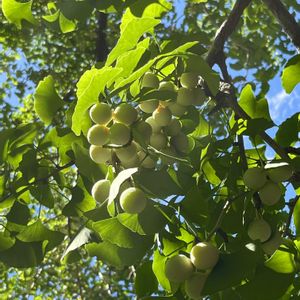 🟢イチョウ(銀杏) 秋には黄色く実るギンナンが、7月にもう緑色の実が成ってました!イチョウには雄と雌があって雌にだけ実が成ります。 ⚫︎イチョウ科 イチョウ属 ⚫︎原産 中国 ⚫︎花期 4月〜5月 ⚫︎果期 9月〜11月