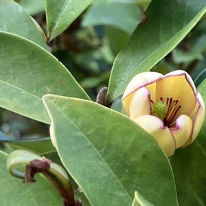 カラタネオガタマ(唐種招霊) モクレン科モクレン属 紅紫色の花弁の縁取りが綺麗です💜💛 花が大きく開かず、半開きのままの 状態が、微笑んでいるように見え 中国では「含笑花」と言われるそうです💕 バナナのような香りが遠くまで届きます🍌😊🎶 中国東南部原産 オガタマノキと同様に神の依代として 葉を神前に供えられ 寺社に植えられることが多い木です🌳