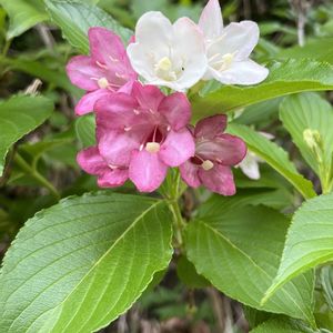 🩷オオベニウツギ(大紅空木) 咲きはじめは白色で咲き進むにつれてピンクに変化していきます。空木に見た目が似ているだけで枝の中が空洞ではありません。 ⚫︎スイカズラ科 タニウツギ属 ⚫︎原産 中国 ⚫︎花期 5月〜6月