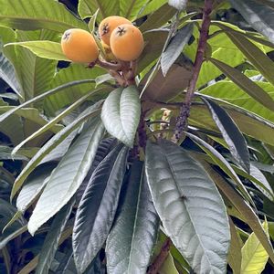 🟠ビワ(琵琶) ビワの花は冬の寒いころに咲いて、晩春から初夏にかけて実が成ります。花から実への成長がゆっくりな特徴があります。 ⚫︎バラ科 シャリンバイ属 ⚫︎原産 中国 ⚫︎花期 11月〜2月 ⚫︎果期 5月〜6月
