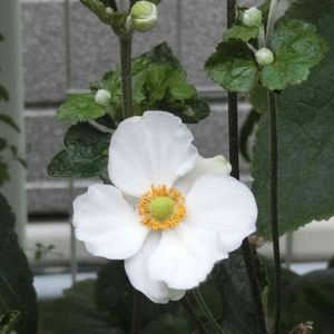 秋の風情を感じる白いシュウメイギク(秋明菊)が咲きました。 古に中国から渡来し京都の貴船地区で野生化したことから、別名キブネギク(貴船菊)とも呼ばれています。 花びらに見えるのは萼片で花びらは 退化してしまっています。 地中根が太く長く伸びて直ぐ繁殖します。 中国・台湾原産。 キンポウゲ科イチリンソウ属の半常緑性多年草。