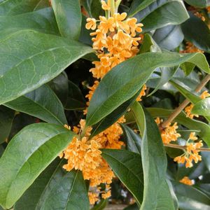 街を歩くとあちこちでキンモクセイ(金木犀)の甘く心地よい薫りが漂っています。 樹皮が犀🦏の足に似ているため中国で木犀と呼ばれ、白い花のギンモクセイに対し橙黄の花をキンモクセイと名付けたようです…。 キンモクセイは雌雄異株ですが、日本に渡来したのは雄株のみで雌株はほとんどなく、挿し木で増やされています。 中国南部原産。 モクセイ科モクセイ属の常緑小高木。
