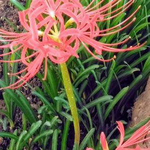 💓ヒガンバナ♪ 秋のお彼岸後(9/28pic)モリモリに咲いていた花が終わり 葉っぱがワサワサ出てきました🤗 今 また2本だけ咲き出しました。 丈が低めで可愛いです😍 花と葉っぱが同時⁉️ 秋の彼岸の頃に花茎だけが伸び花茎の先に花が咲き 花が終わってから葉が伸びて夏に枯れる。 別名 曼珠沙華 花言葉『情熱』『諦め』『独立』
