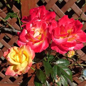 おはようございます😃 薔薇🌹チャールストン 調べてみました。 咲き始めは花弁が黄色で咲き進むにつれ赤みが増す。 日照時間と気温により花色には強弱があり、春より秋の花の方が鮮やかに変化。