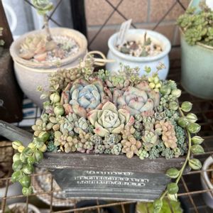 こんにちは 今日は多肉日和☀️ お直ししたい寄せ植えたくさんあるんですけど…🤣🤣 これから仕事… とりあえず、ひとつお直し 大好きなプロリフェラと姫秋麗で寄せました♪