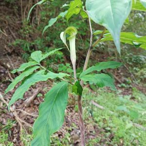 山道ノロノロ③ マムシグサ(サトイモ科テンナンショウ属) 山道をノロノロ走っていて見つけました。 葉っぱが立派なマムシグサですね。