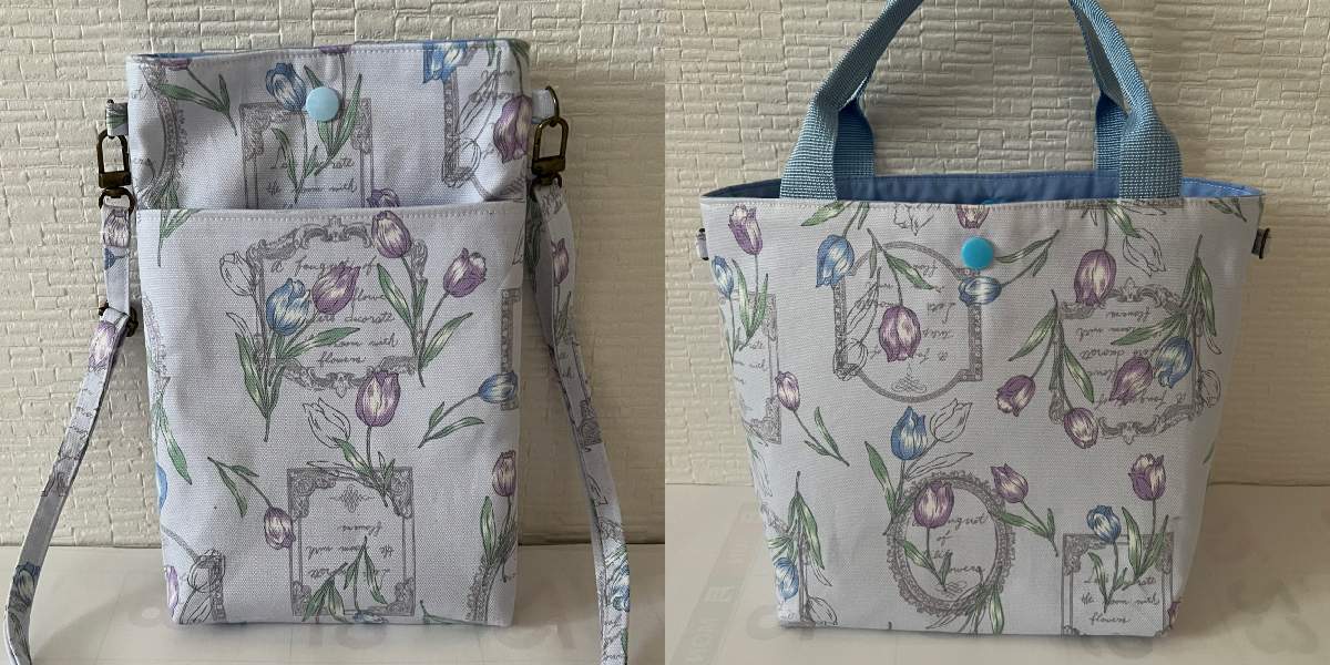カバーは手作りのスマホポーチとミニトートバッグ柄はパステルカラーのチューリップ